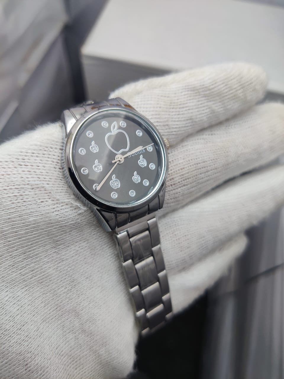 Soons Trendy Apple Motif Women's Quartz Watch - Crystal Accents on Dark Dial